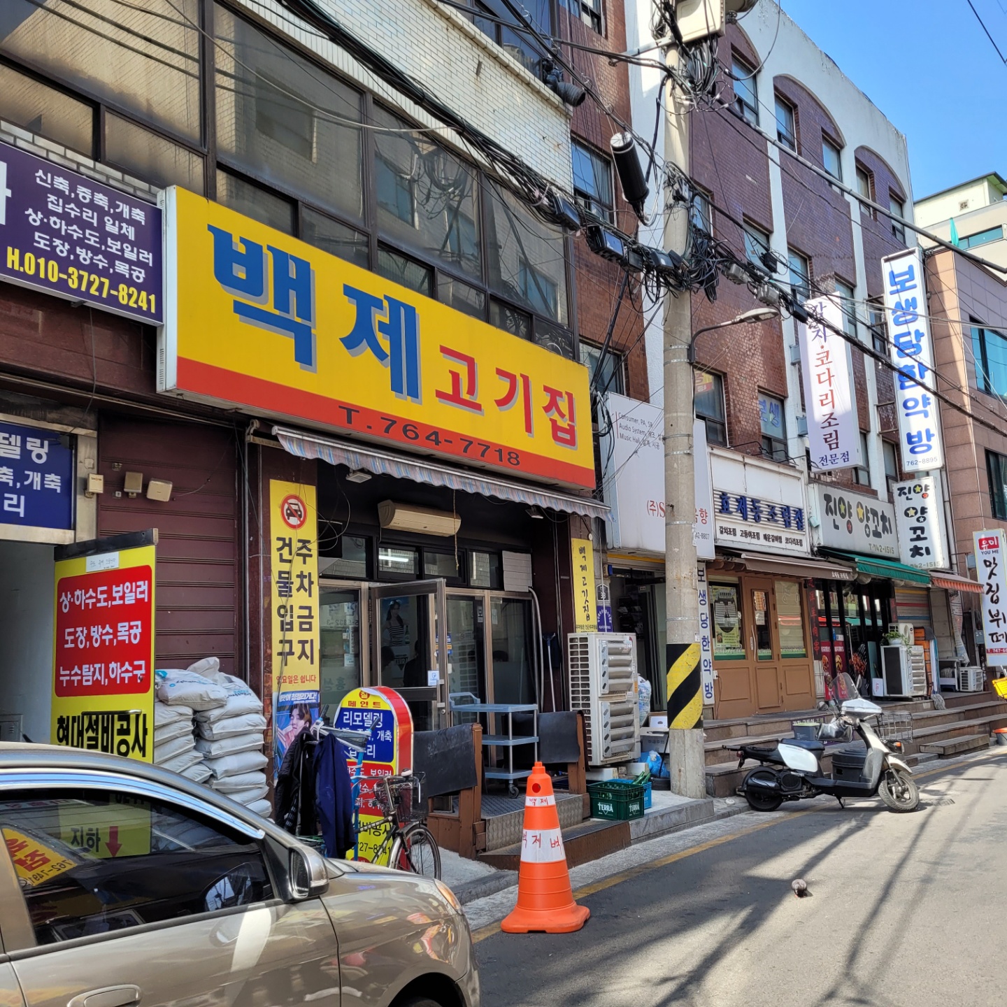 여기로 들어가면 맞은 편 집으로 들어가라고 하십니다. 백제고기집. 바로 여기요.