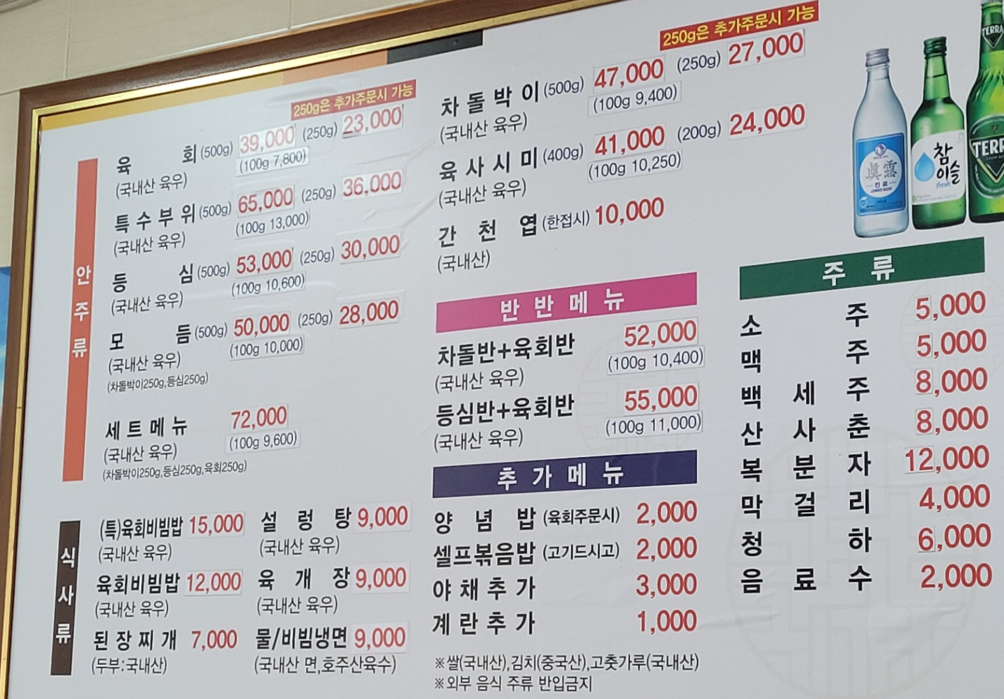 일단 일행들과 자리를 잡고 백제정육점 메뉴판을 보았습니다.