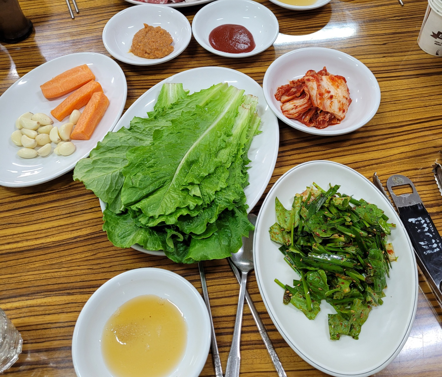 상추, 당근, 마늘, 된장, 고추장, 김치 등이 먼저 세팅되어서 나옵니다.